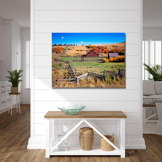 Colorado Ranch Photo Canvas, Rustic Style Old Barn and Split Rail Fences, Cowboy Art Photography, Fall Color, Western Large Wall Picture