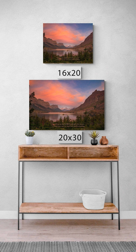 Proverbs 3:5 Christian Inspirational Wall Art, Trust in the Lord Scripture Canvas, Glacier National Park Sunrise Photography, St Marys Lake