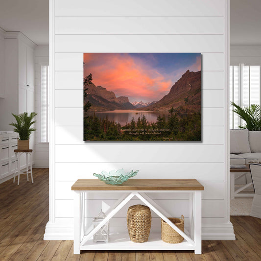 Proverbs 16:3 Christian Inspirational Wall Art, Commit Your Works to the Lord, Scripture Canvas, Glacier National Park Sunrise Photography