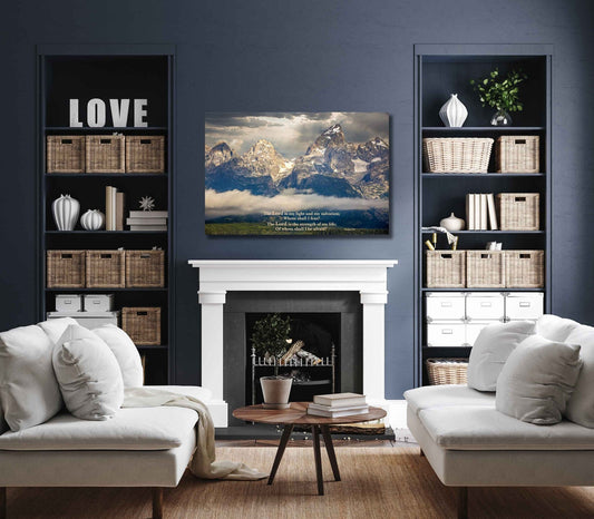Psalm 27:1 Scripture Print, Christian Inspirational Wall Art, Grand Teton Mountaintop Peaks, The Lord is My Light, Wyoming Landscape