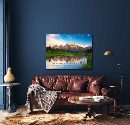 Psalm 103:1 Christian Inspirational Wall Art, Bless the Lord O My Soul, Scripture Canvas, Grand Teton Sunrise Photography, Customization