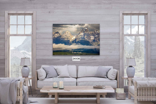 Psalm 46:10 Scripture Wall Art, Christian Inspirational Canvas, Be Still and Know, Grand Teton Mountaintop Peaks, Wyoming Landscape Print