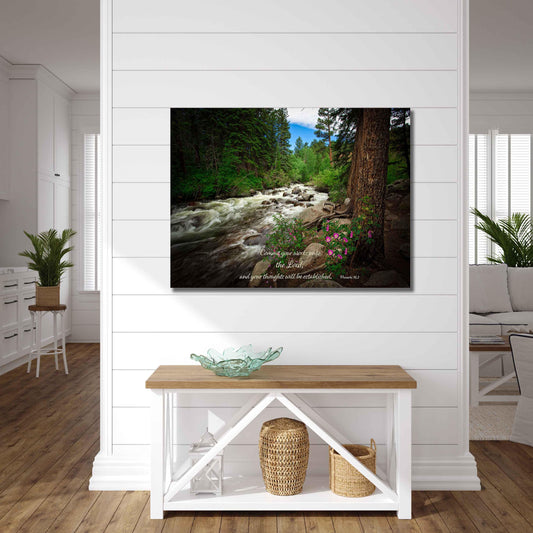 Proverbs 16:3 Christian Inspirational Wall Art Print, Rocky Mountain National Park Tuxedo Creek with Wild Roses, Colorado Landscape Canvas