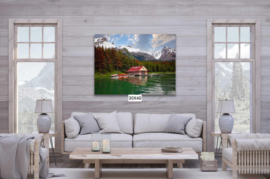 Jasper National Park Landscape Photo Print, Maligne Lake Boat House, Canadian Rockies, Alberta Canada, Banff, Large Canvas Wall Art