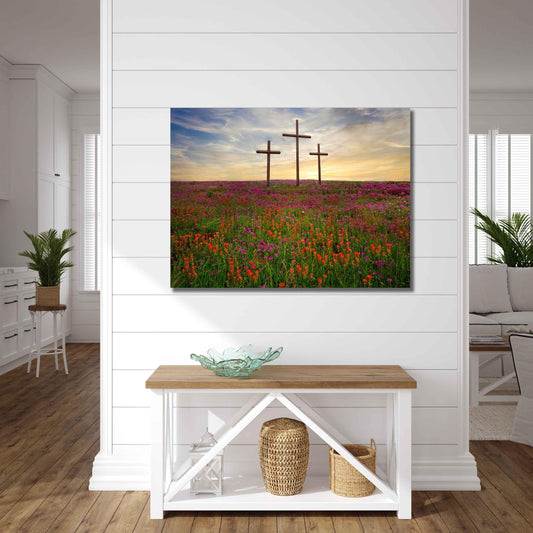 Christian Inspirational Wall Art – Three Crosses Canvas with Texas Wildflowers Sunset Print