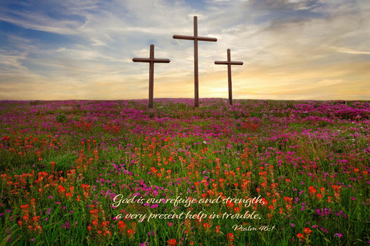Psalm 46:1 Christian Inspirational Scripture Canvas, God is Our Refuge and Strength, Three Crosses Photo, Texas Wildflower Landscape Sunset