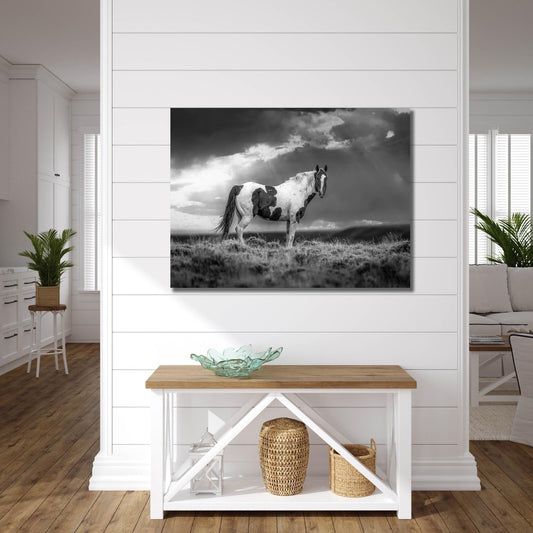 Wild Pinto Stallion Black and White Horse Photo, Wyoming Mustang Wall Art Print, Rocky Mountain Wildlife Canvas, Cowboy Old West Decor