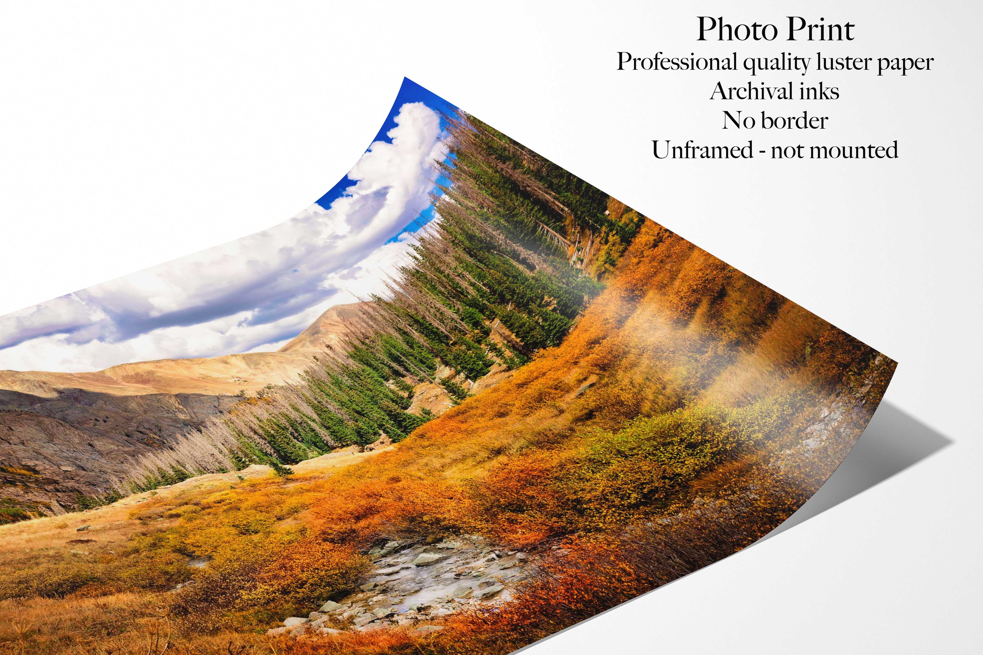 Beautiful mountain scenery available in fine art prints and canvases, from sizes in 8" x10" to 40"x90" triptych (3 panels). Perfect for a variety of decor situations, including living, bedroom, dining, game room and office.
